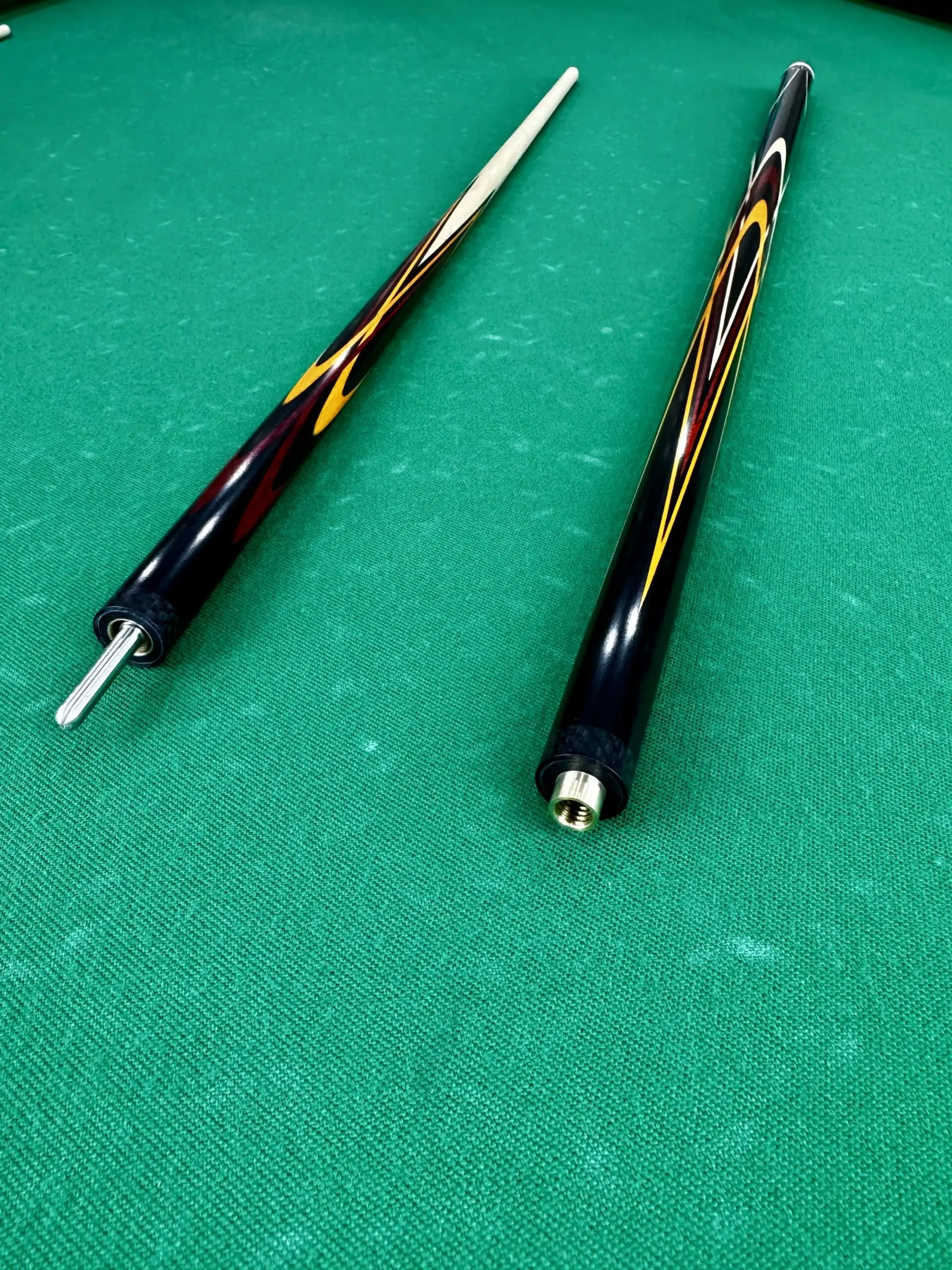 Смарагдові елементи в дизайні кию додають їй свіжості та візуальної привабливості. Зелені акценти створюють гармонійний контраст із темним чорним грабом і теплим белінго, роблячи кий справжнім декором на більярдному столі. Смарагдовий колір символізує гармонію та баланс, які так необхідні у грі.