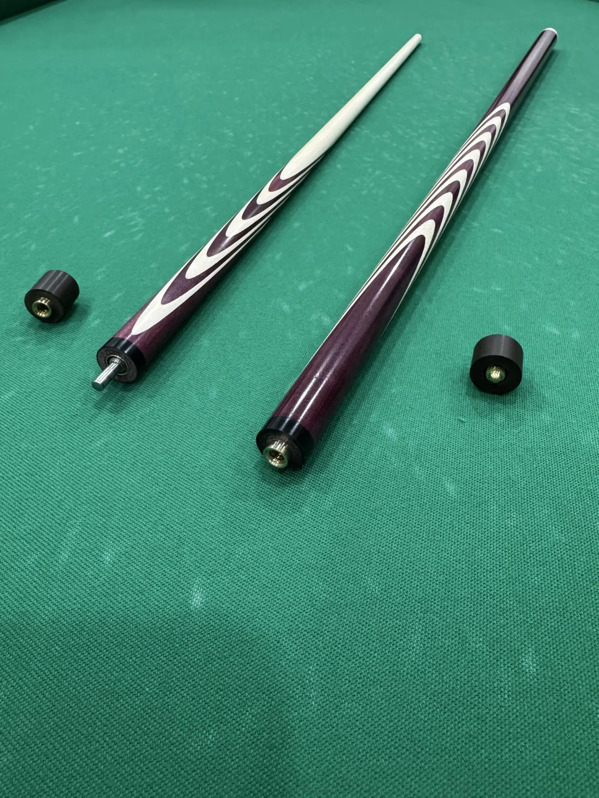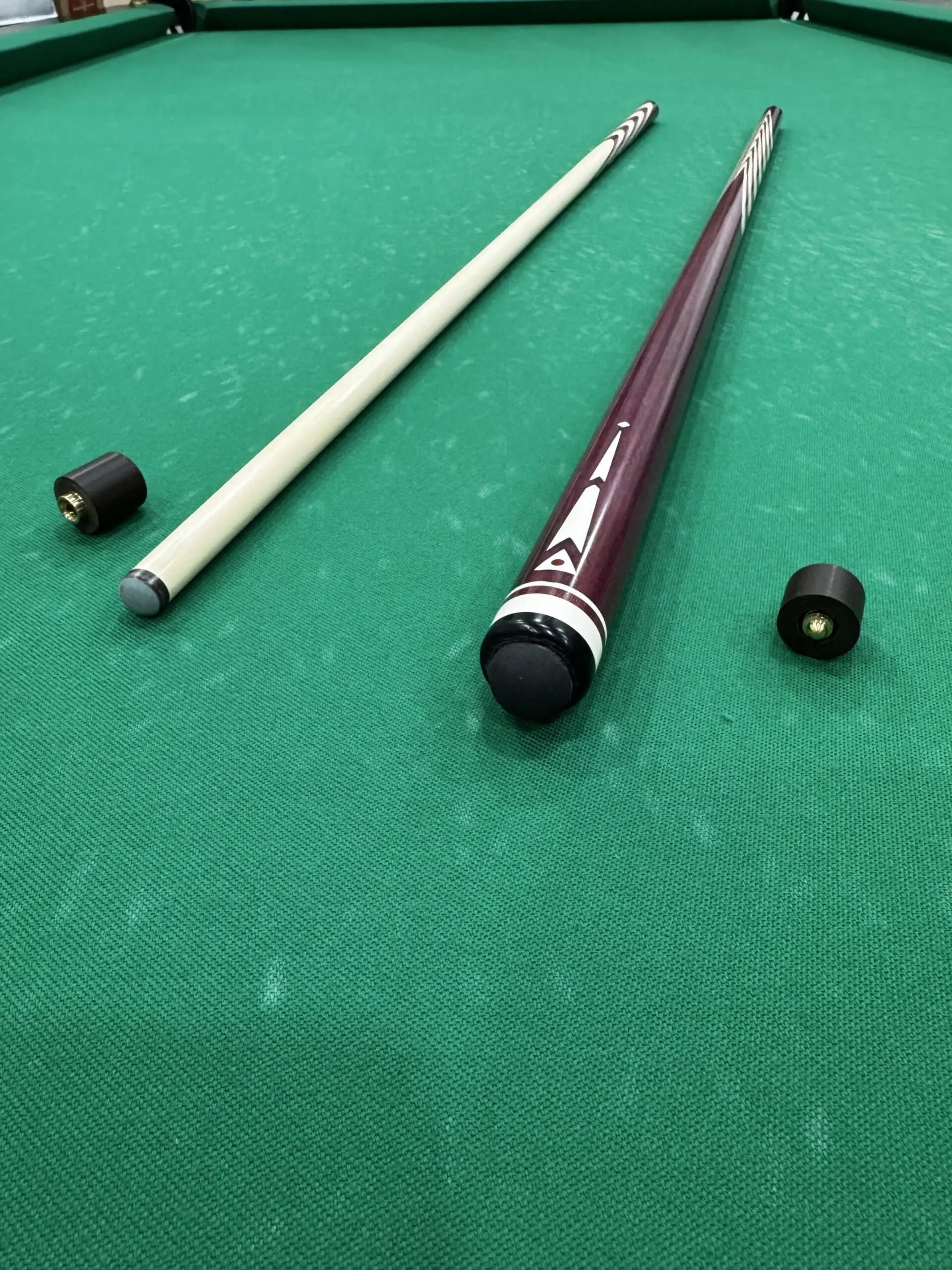Конструкція з 10 запилами: Запили забезпечують оптимальне розподілення напруги при ударі, підвищуючи точність та стабільність гри. Геометрія запилів виконана у вигляді трикутного малюнка, що додає візуальної привабливості та гармонії. Матеріал: Амарант – благородна деревина з характерним глибоким фіолетово-коричневим відтінком. Цей матеріал відомий своєю щільністю, довговічністю та стійкістю до зовнішніх впливів. Поверхня ретельно відполірована для гладкості та комфорту у використанні. Інкрустація: Інкрустація виготовлена з цінних матеріалів, таких як перламутр, метали або інші декоративні елементи. Трикутний візерунок інкрустації підкреслює елегантність та ексклюзивність кия. Баланс і точність: Ретельно розрахований баланс покращує контроль над києм, дозволяючи завдавати потужних та точних ударів.