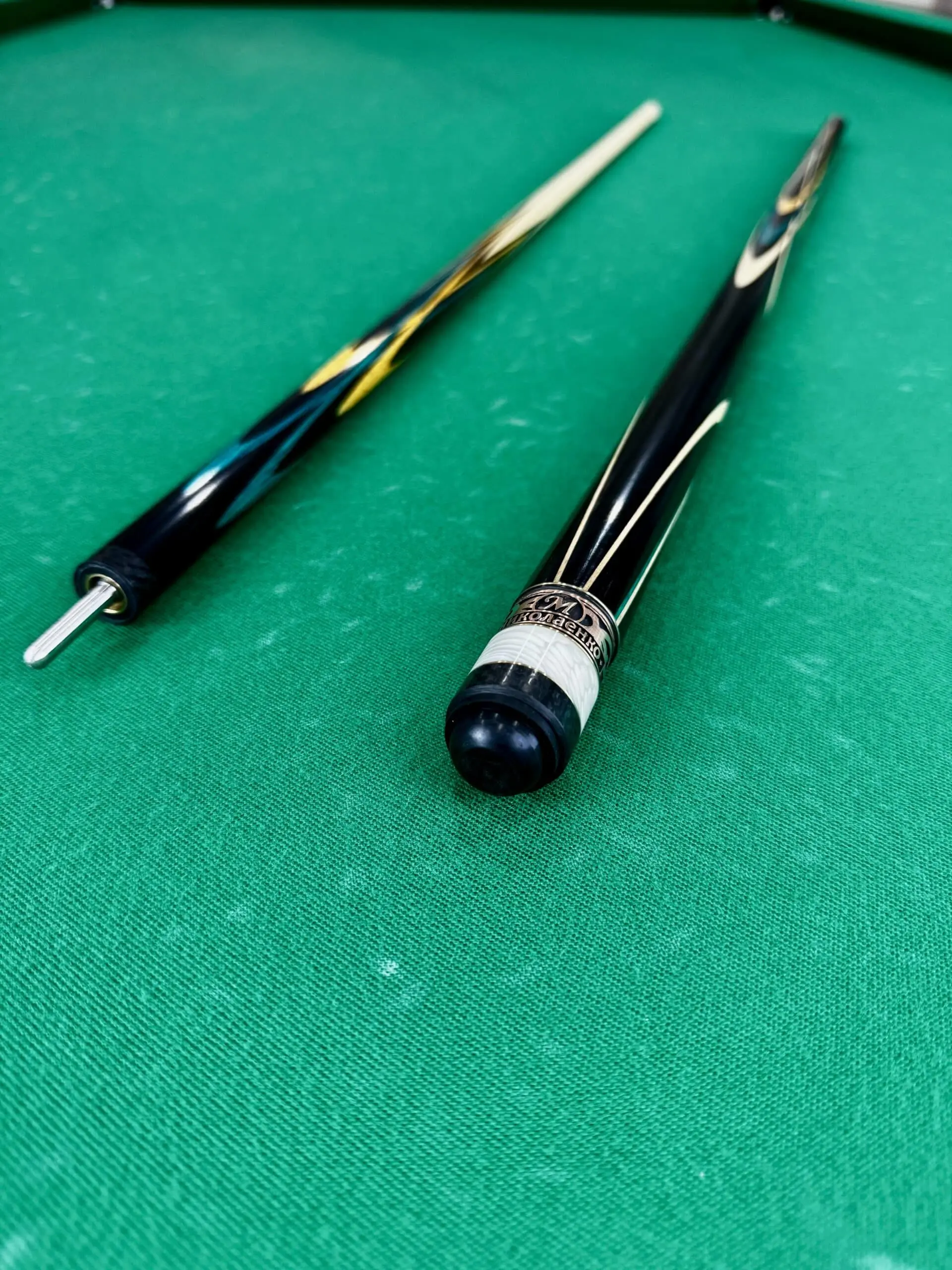 Кий «Тюльпан» Максима Ніколаєнка — це не просто інструмент для гри, а справжній витвір мистецтва. Кожен елемент цього сигналу продуманий до найдрібніших деталей — від вибору дерева до фінальної обробки. Поєднання чорного граба, амарілло та зеленого граба створює унікальну палітру кольорів, яка вирізняє цей сигнал серед інших і підкреслює його ексклюзивність.