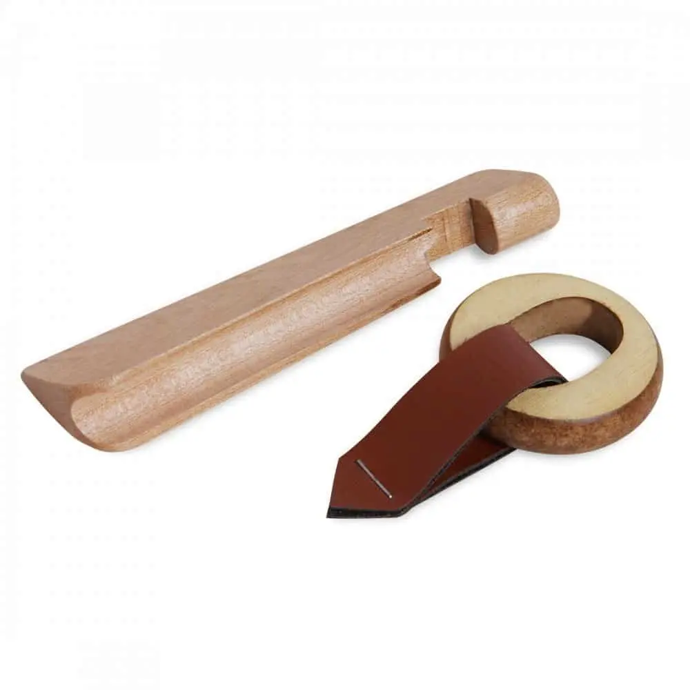 Інструмент, який значно полегшує роботу зі зміни наклейки на більярдному ки, надійно фіксуючи її на час, поки засихає клей. Ймовірно, кожен гравець, який самостійно змінював наклейку, стикався з тим, що поки клей не схопився, наклейка може зміститися. Тим часом, наклейку необхідно не просто приклеїти, а максимально щільно притиснути до склянки, щоб у простір між поверхнями, що склеюються, не потрапили мікроскопічні бульбашки повітря, які знизять міцність з’єднання. Фіксатор значно полегшує процес: приклейте наклейку, встановіть наконечник шафта в паз і закріпіть його за допомогою кільця зі шкіряною петлею – воно з’єднає всю конструкцію міцно і в той же час акуратно. Коли клей висохне та наклейка зафіксується на шафті, залишиться лише обробити її за допомогою спеціалізованих інструментів.