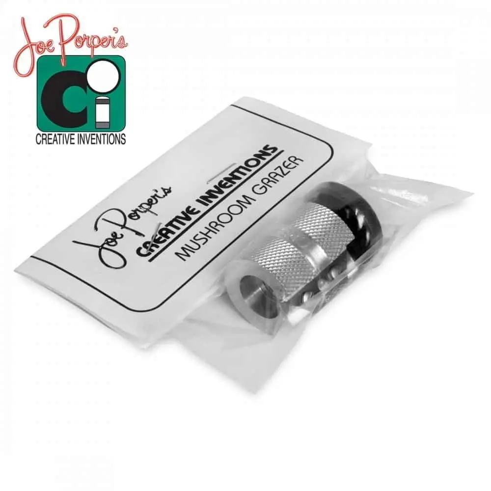 Інструмент Joe Porper`s Mushroom Grazer призначений для обробки країв наклейки діаметром до 14 мм при появі у неї форми “грибного капелюшка”. Такий дефект знижує якість гри, оскільки гравець не має можливості зробити точний, акуратний удар. Краї деформованої наклейки, що виходять за межі діаметра шафта, необхідно акуратно зрізати. Joe Porper`s Mushroom Grazer допоможе швидко привести наклейку до ладу. Для цього надягніть інструмент на шафт із наклейкою, за допомогою гвинта відрегулюйте висоту установки леза таким чином, щоб під нього потрапила лише наклейка. Утримуючи однією рукою інструмент, іншою акуратно повертайте шафт. Зробіть повний оберт кия всередині інструменту і зніміть Joe Porper`s Mushroom Grazer з кия. Після того, як надлишки наклейки будуть зрізані, слід відполірувати її краї і, при необхідності, продовжити обробку для надання наклейці правильної сферичної форми та необхідної текстури. Двостороннє лезо інструменту для обробки наклейки Joe Porper`s Mushroom Grazer виготовлене із сталі, яка використовується при виробництві хірургічних інструментів. Це дозволяє робити акуратні зрізи, не розшаровуючи краї наклейки. Щоб змінити ріжучу сторону леза, необхідно відкрутити гвинти, перевернути лезо та знову прикрутити його до корпусу.