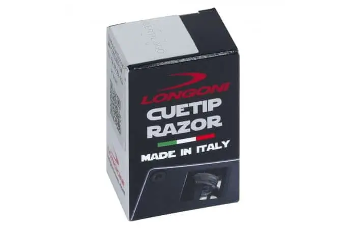 Виготовлений в Італії, багатофункціональний інструмент для обробки наклейки Edger Longoni Cuetip Razor складається з пластикового корпусу, сталевого леза і містить абразивну поверхню для надання сфери. Призначений для обробки країв більярдної наклейки і надання їй сфери діаметром від 11,8 до 12,8 мм: