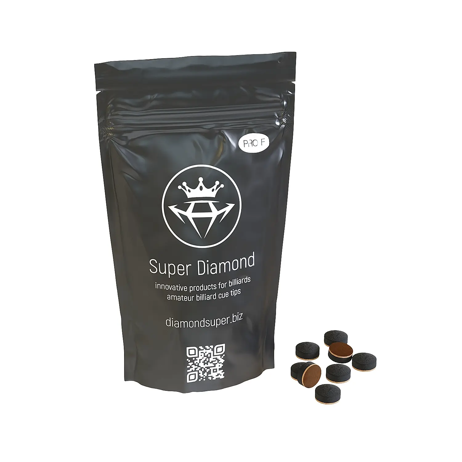 Super Diamond PRO F — це бюджетна двошарова наклейка з чорної шкіри з твердістю 80 Shore і текстолітовим волокном. Найкраще рішення для більярдних клубів та аматорів.