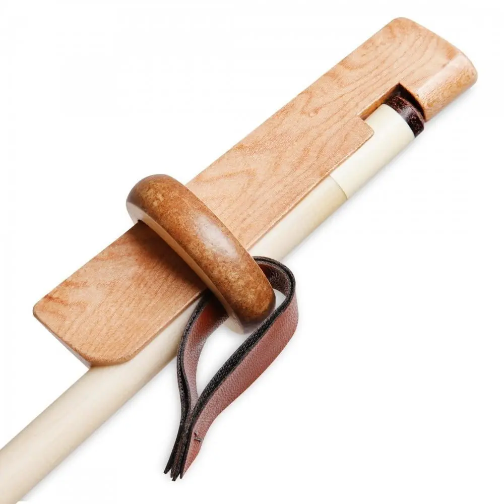 Инструмент, который значительно облегчает работу по смене наклейки на бильярдном кие, надежно фиксируя ее на время, пока засыхает клей. Вероятно, каждый игрок, самостоятельно менявший наклейку, сталкивался с тем, что, пока клей не схватился, наклейка может сместиться. Между тем, наклейку необходимо не просто приклеить, а максимально плотно прижать к стакану, чтобы в пространство между склеиваемыми поверхностями не попали микроскопические пузырьки воздуха, которые снизят прочность соединения. Фиксатор значительно упрощает процесс: приклейте наклейку, установите наконечник шафта в паз и закрепите его с помощью кольца с кожаной петлей – оно соединит всю конструкцию прочно и в то же время аккуратно. Когда клей высохнет и наклейка зафиксируется на шафте, останется только обработать ее с помощью специализированных инструментов.