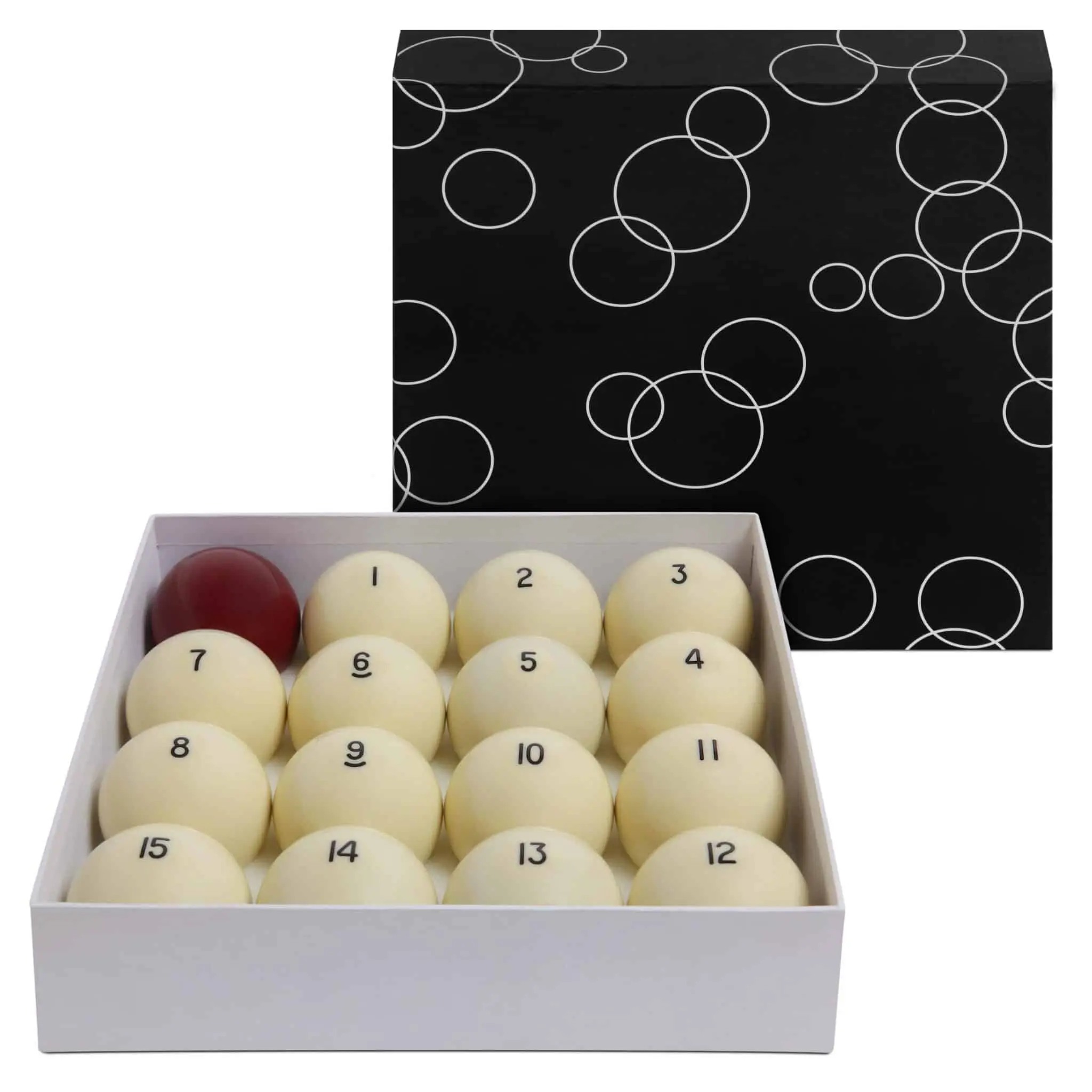 В наборе 15 шаров и биток стандартного размера 68 мм, упакованных в картонную коробку.
